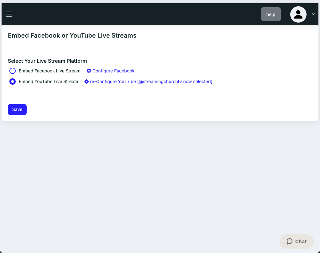 First you choose whether you prefer to use your Facebook Live stream or your Youtube live stream. Then enter either your Facebook Live stream page or your Youtube Channel Name.