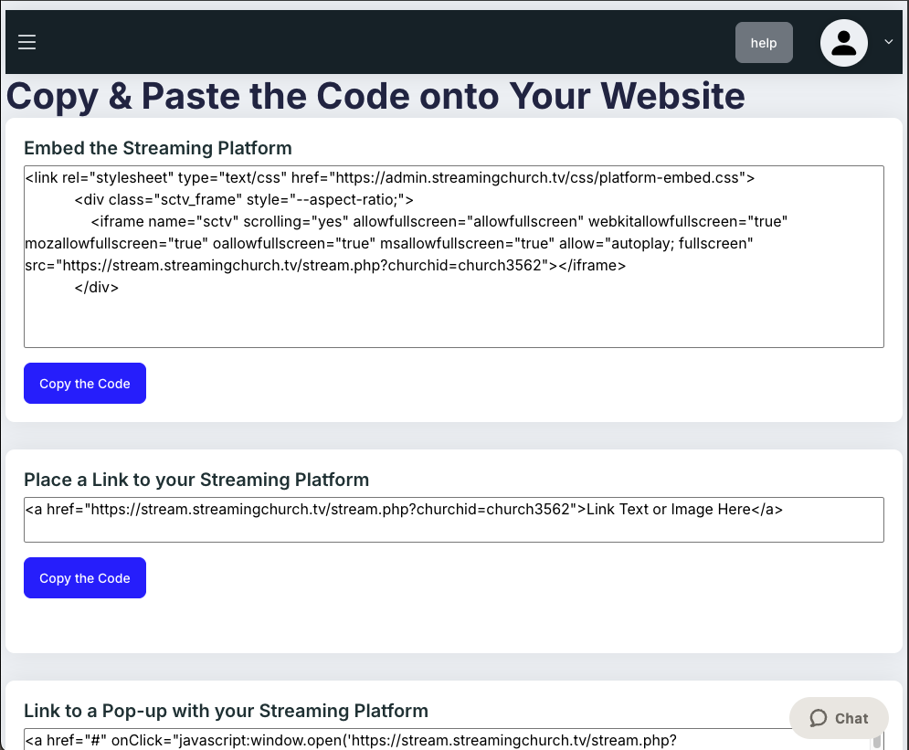 Access your embed code and copy and paste it onto your church website wherever you want your live stream to appear. Your live stream will appear here whenever you go live on Facebook or Youtube!