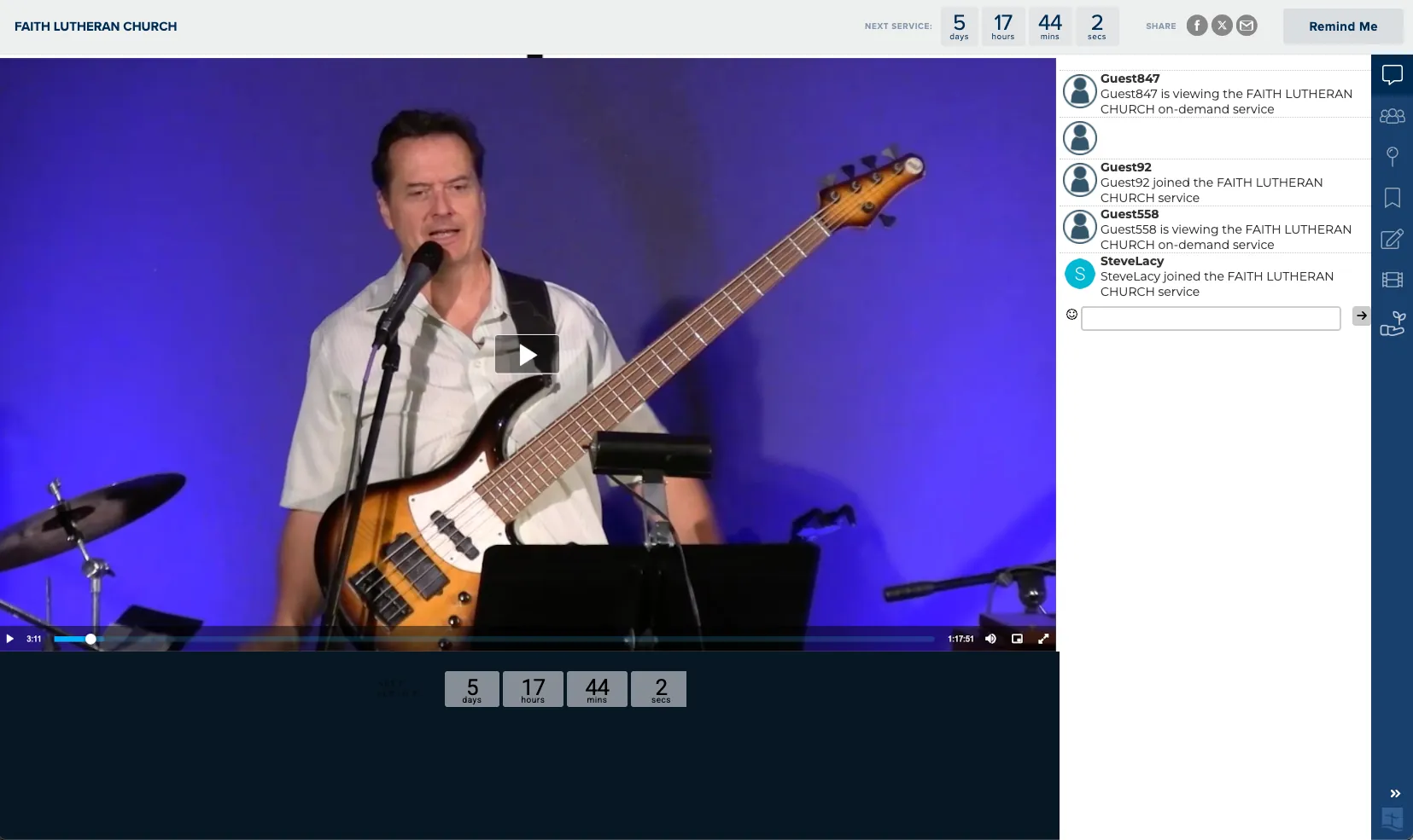 Schedule your service on your StreamingChurch.tv admin panel and then go live on your Facebook or Youtube stream. Your live stream with all of your ministry tools will appear on your church website or wherever you choose to display your live stream. No more distractions for your viewers! Just your live stream and your online ministry tools you prefer.
